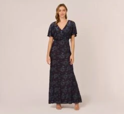 All your special occasions will be spent looking effortlessly chic when wearing our long gown, crafted of a beautifully textured burnout stretch velvet in a floral pattern. You’ll strike a stunning figure, thanks to our iconic (and flattering) blouson silhouette. All the details: surplice neckline, floaty flutter sleeves and pleating at the knees for added movement and sway.