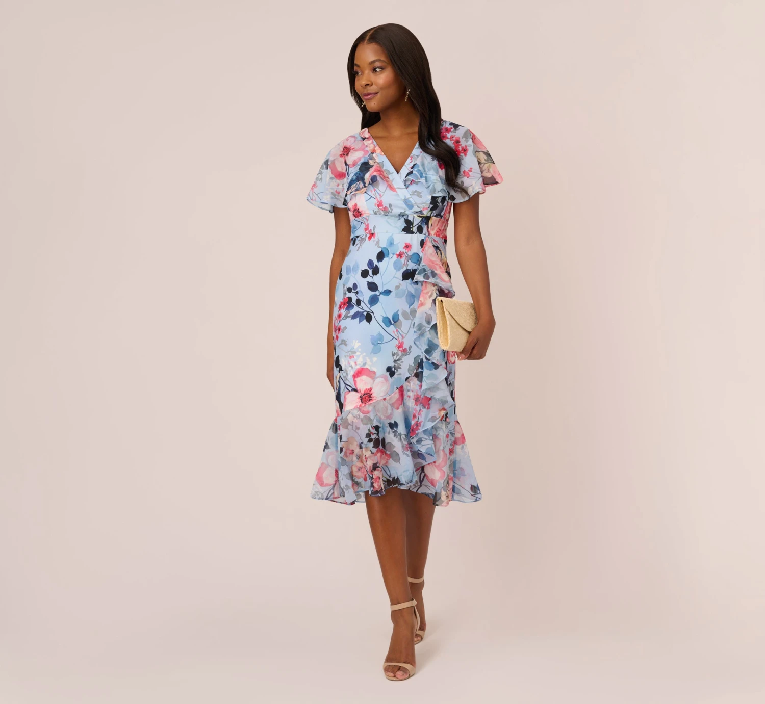 Flowing and artful, designed in feather-light chiffon with a faux wrap bodice that streamlines the silhouette. We love the summery flutter sleeves, graceful cascading ruffles and chic, midi-length skirt.