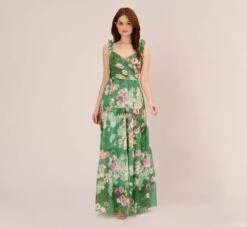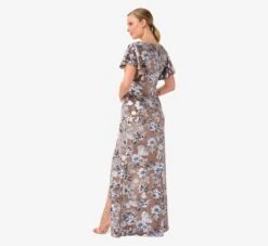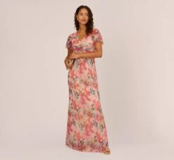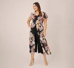 A striking metallic foil floral print gives a feminine spin to this mermaid dress crafted of a lightweight crinkled mesh. This charming dress features a ruffled capelet and a surplice neckline that descends to a midi skirt with playful cascading ruffle accent and ruffled hem. Finished with a self-tie belt to accentuate your waist. Back zipper with hook and eye closure. A versatile style to keep on rotation for bridal showers, engagement parties and wedding receptions.