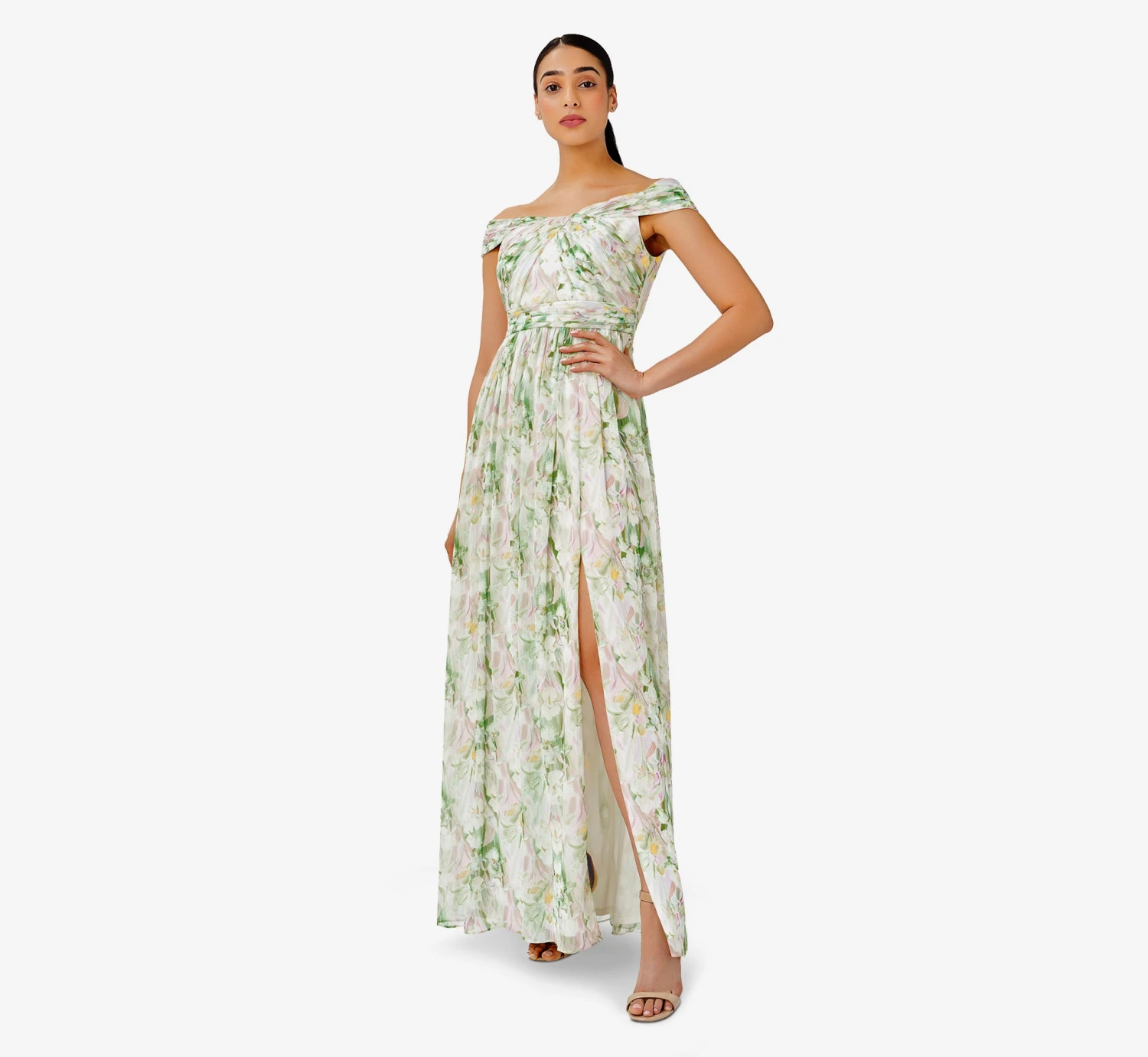 Ethereally light and feels like a dream, we love this floaty off-the-shoulder shirred chiffon gown in a romantic floral print. Obsessed with the twisted knot detail and banded waist. (so flattering.) We’ve added a no-slip silicone band at the neckline. Perfect for wedding parties, black-tie galas and any other reason to celebrate. (P.S. pack so easily.)