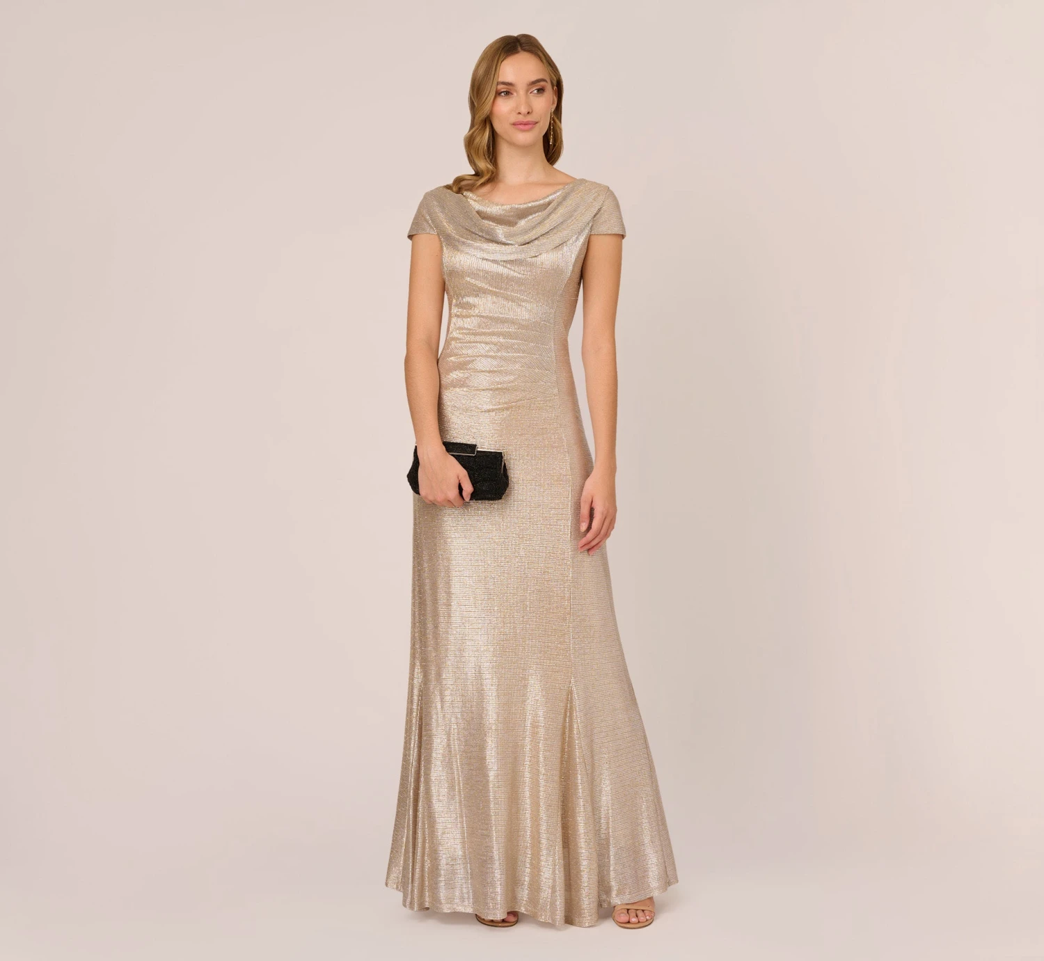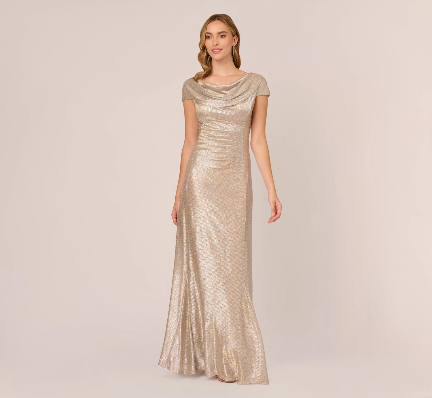 Alluring yet sophisticated, our showstopping gown is designed in a soft and shimmering metallic foil and is every bit stunning from the drapped neckline to the floor-grazing hem. We’ve added gentle ruched detailing along the waist for added texture and dimension. Perfect to add to your special occasion rotation.