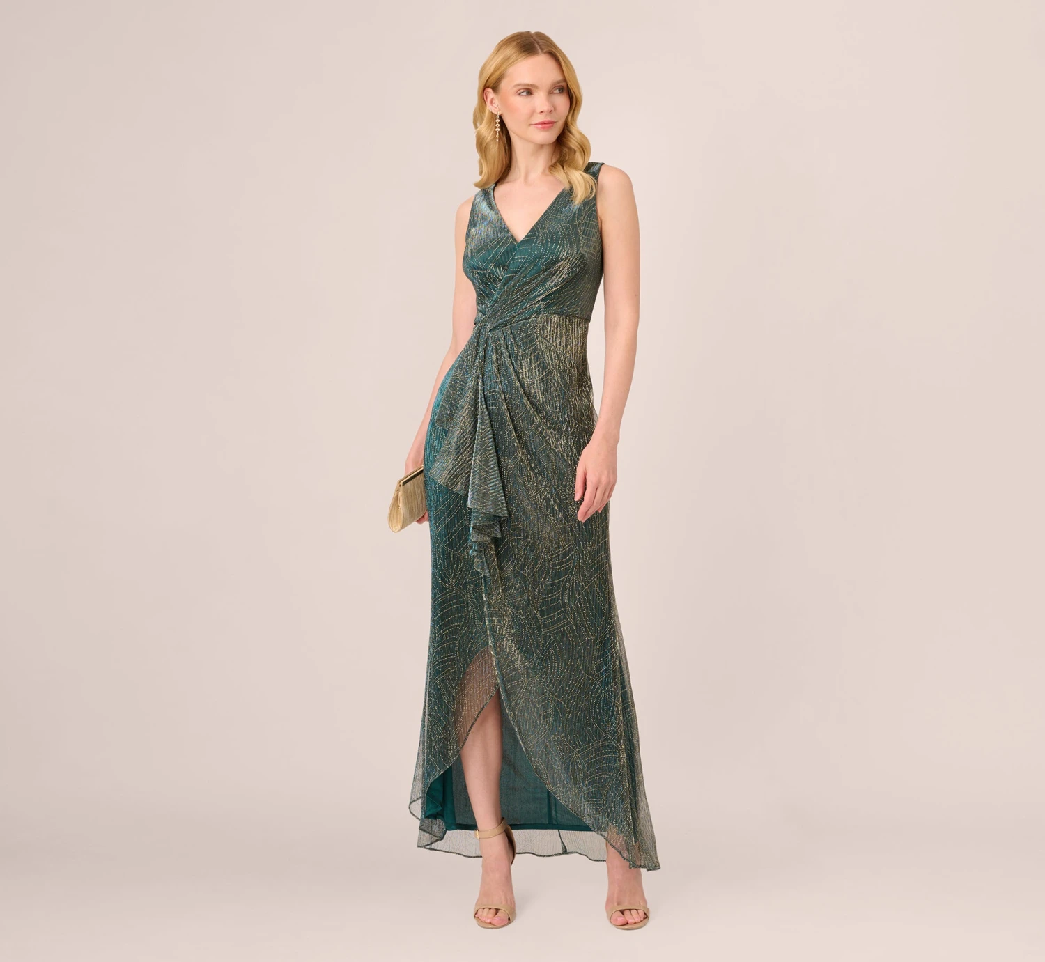 Turn on the sparkle at your next event in this metallic evening gown. This formal dress features a sleeveless surplice bodice, draped and ruffled details that fall from hip to hem, and a split skirt. Partially lined and crafted from metallic threaded mesh, this sleeveless gown has a sheer skirtthat shows off the legs at the front. A zipper back closure completes this ethereal look. Statement earrings and metallic heels are the perfect accessory to add further polish to this metallic dress.