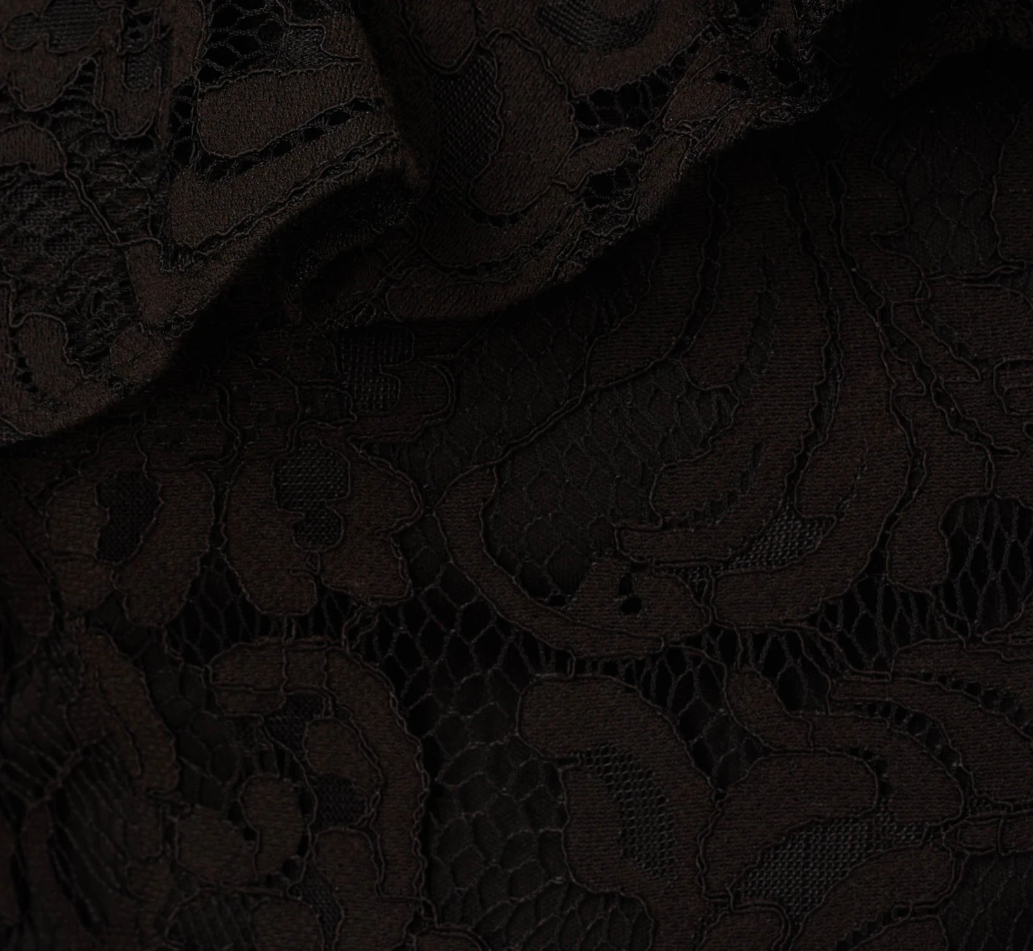 Skip the little black dress and opt for this one shoulder jumpsuit at your next event. This jumpsuit features a fitted bodice with a one shoulder neckline that is accented by layers of beautiful lace for a ruffled look. Wide leg pants crafted from crepe fabric add contrast to this simple yet elegant jumpsuit. A side zipper completes the design. Styled with a statement earring and strappy high heels, this jumpsuit scales from dressy for day to formal attire.