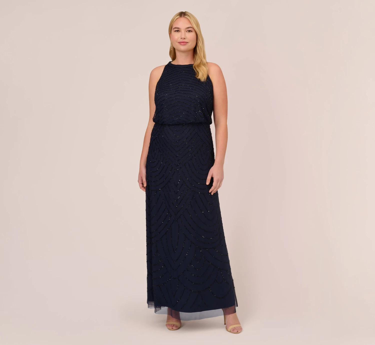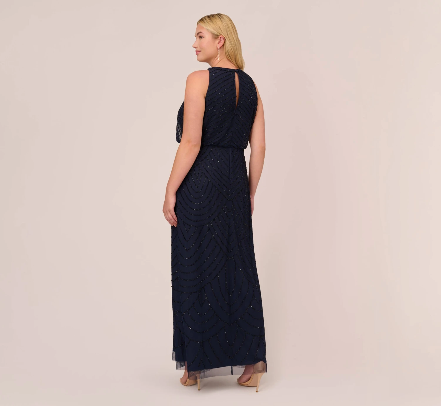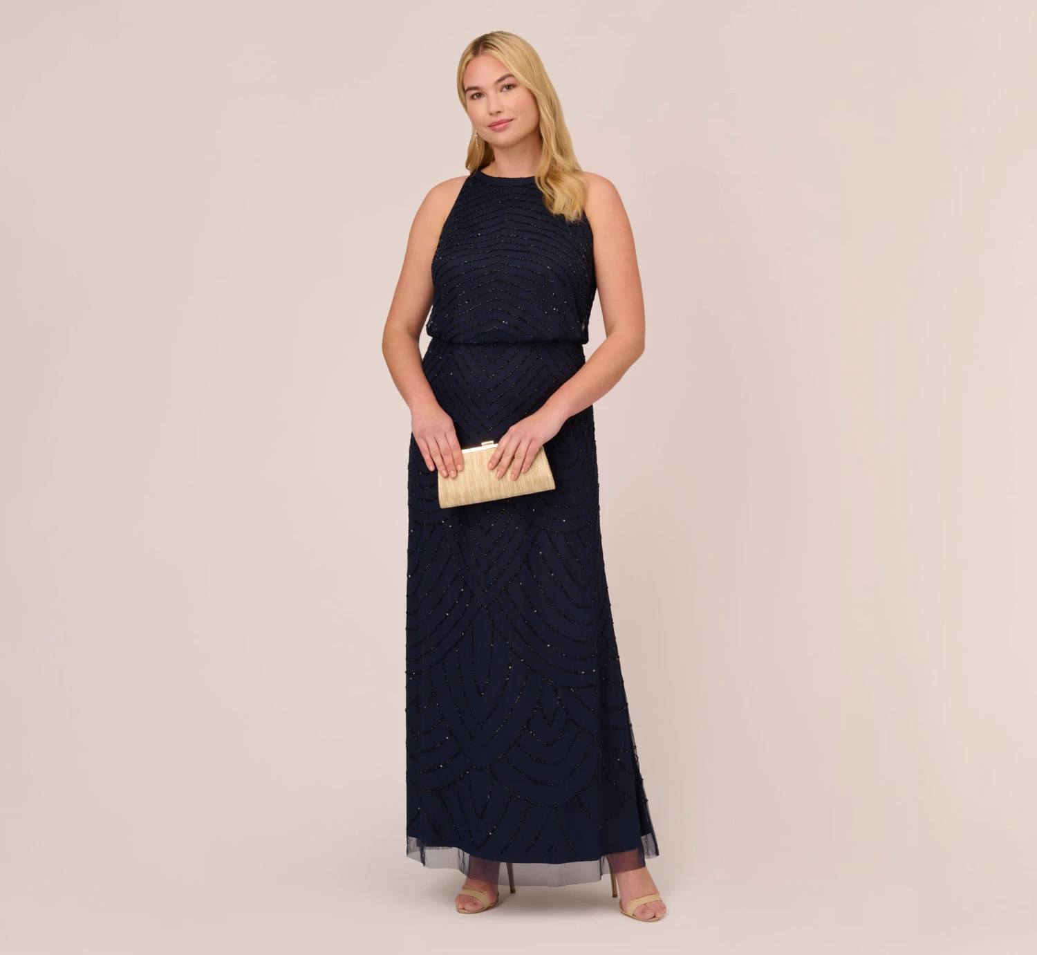 Create a high impact look at your next formal event when you choose this beautiful, beaded evening dress. For that upcoming wedding or gala, this special occasion gown features a blouson bodice, sparkling scalloped beading, and a flowing straight skirt. The back features a zipper closure and keyhole detail. Pair this beautiful sleeveless evening dress with chandelier earrings and a sleek metallic clutch for a jaw-dropping look sure to turn heads all evening.