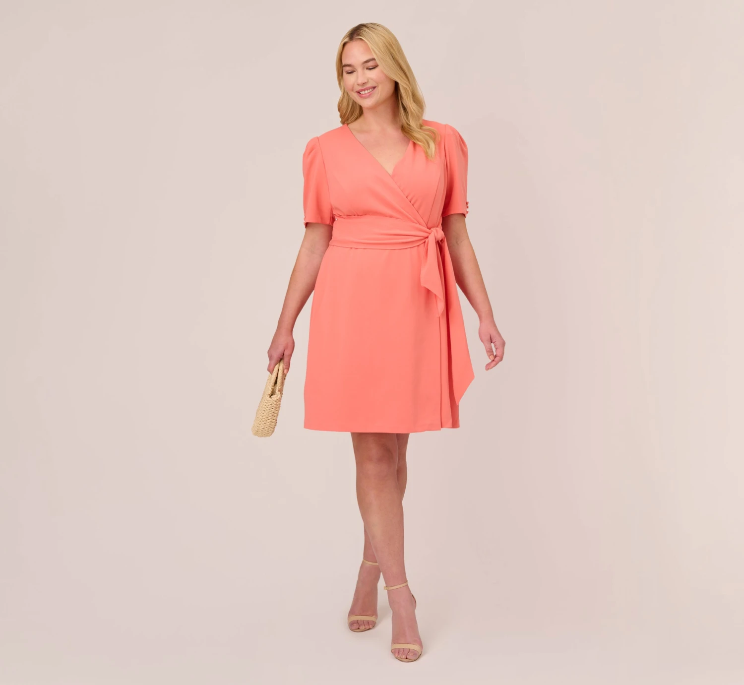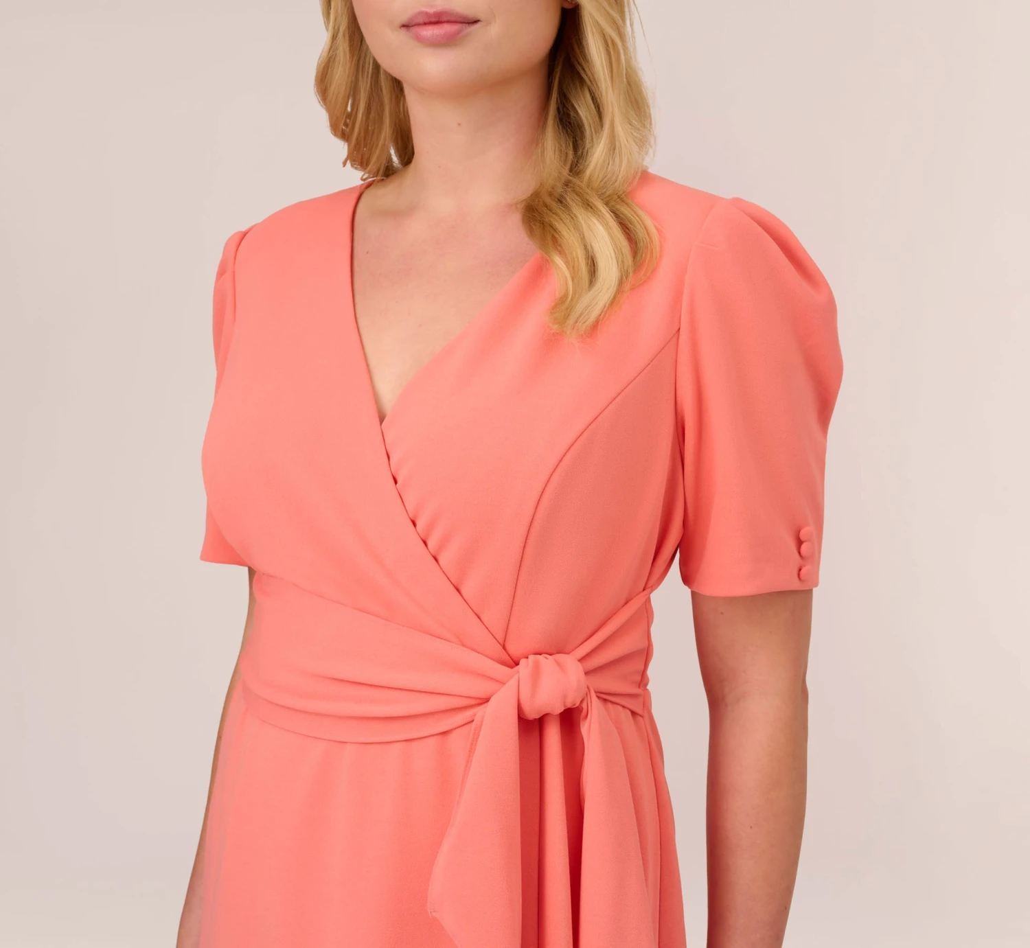 Sophisticated and on point, our wrap-style dress is made in a lightweight and smooth stretch knit crepe and features an oversized self-tie belt (so flattering) and modern elbow sleeves. Sleek back zip closure. Perfect for brunch, bridal showers, cocktail hours and dinner dates.