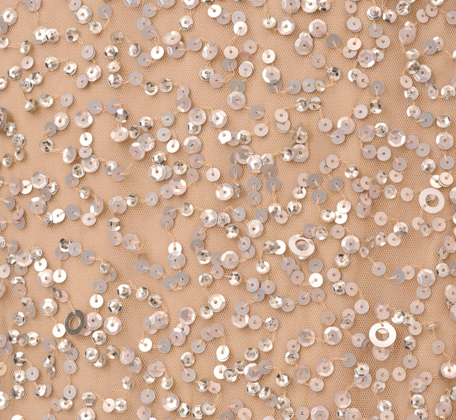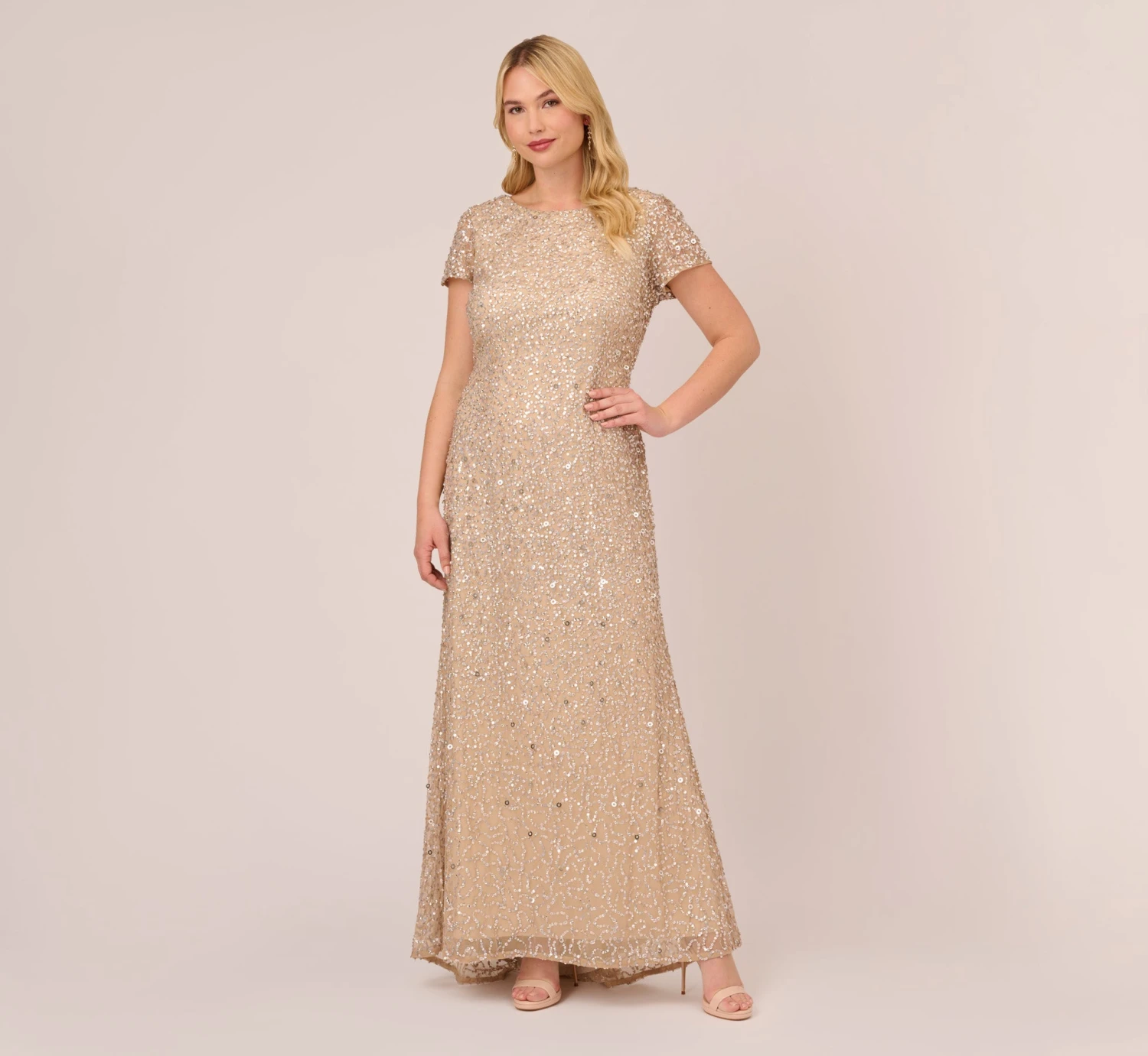 A dramatic and eye-catching scoop back gown is covered in glittering sequins, finished with a sheer partial train.This Adrianna Papell design has been made from the finest and most luxurious fabrics. All bead work, embroidery and ornamentation has been done completely by hand. Slight irregularities or variations should not be regarded as defective or damaged, rather a testament to the garment’s unique beauty.