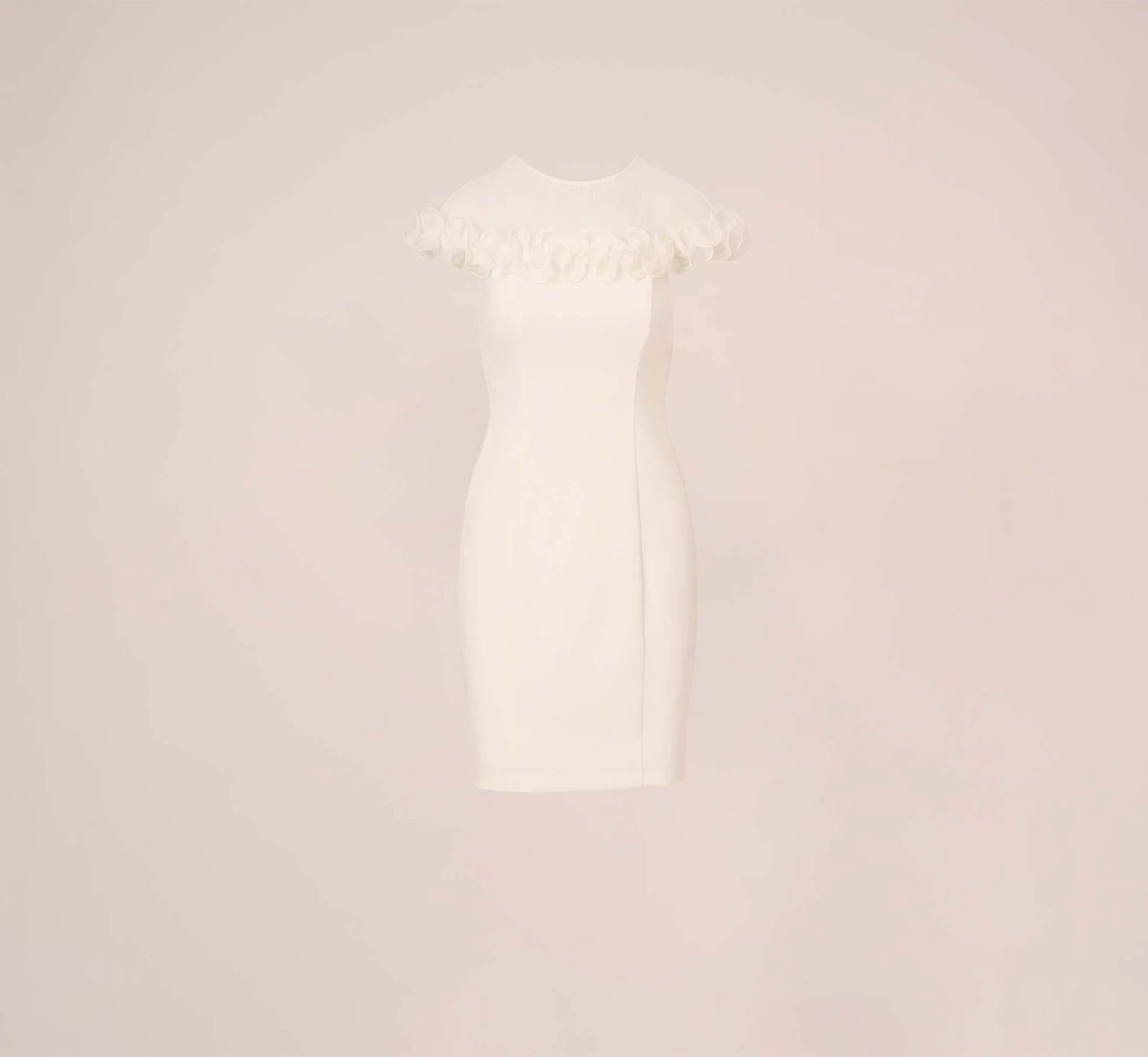 A row of pretty chiffon rosettes frames this feminine sheath dress crafted of our signature knit crepe with a touch of stretch for ease and comfort. This curve-hugging silhouette features a sheer yoke with pleated accents and no waist seam for added comfort. Back zipper with hook and eye closure. We love this for bridal showers, cocktail hours, engagement parties and destination weddings.