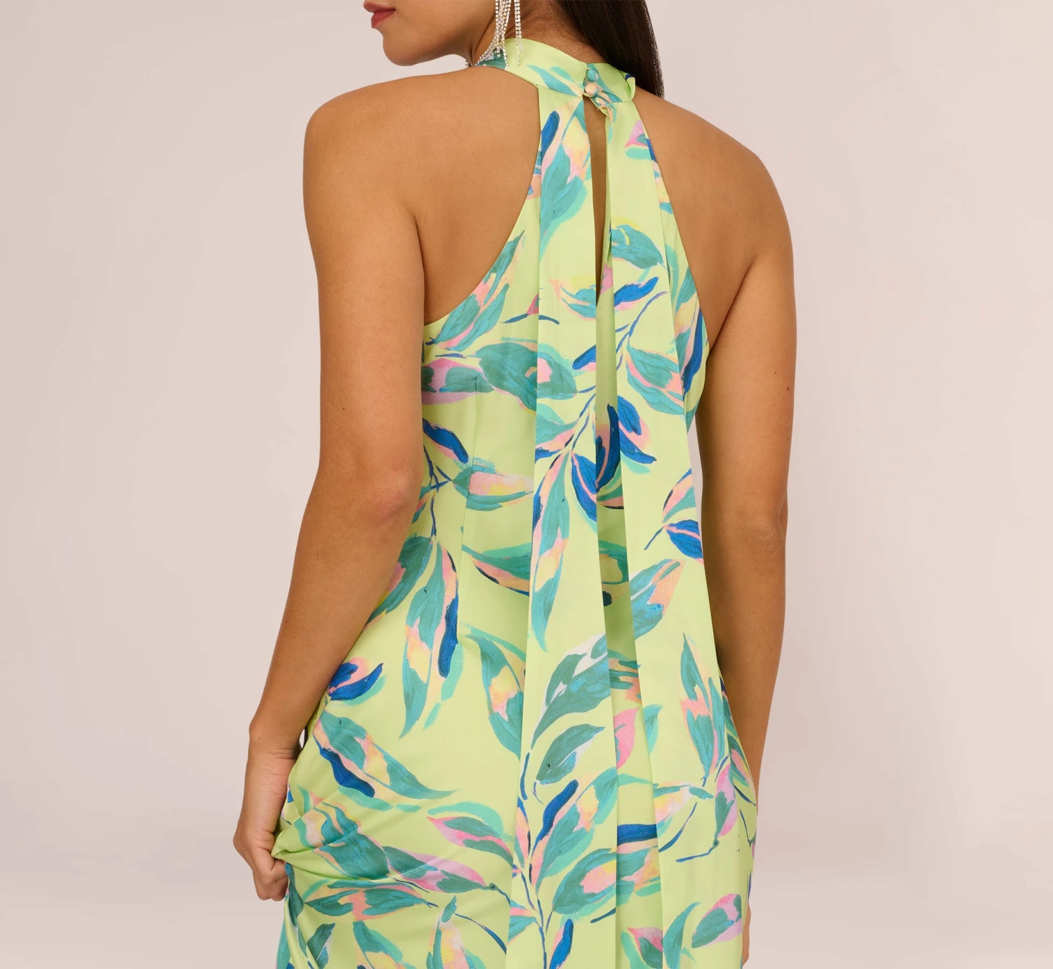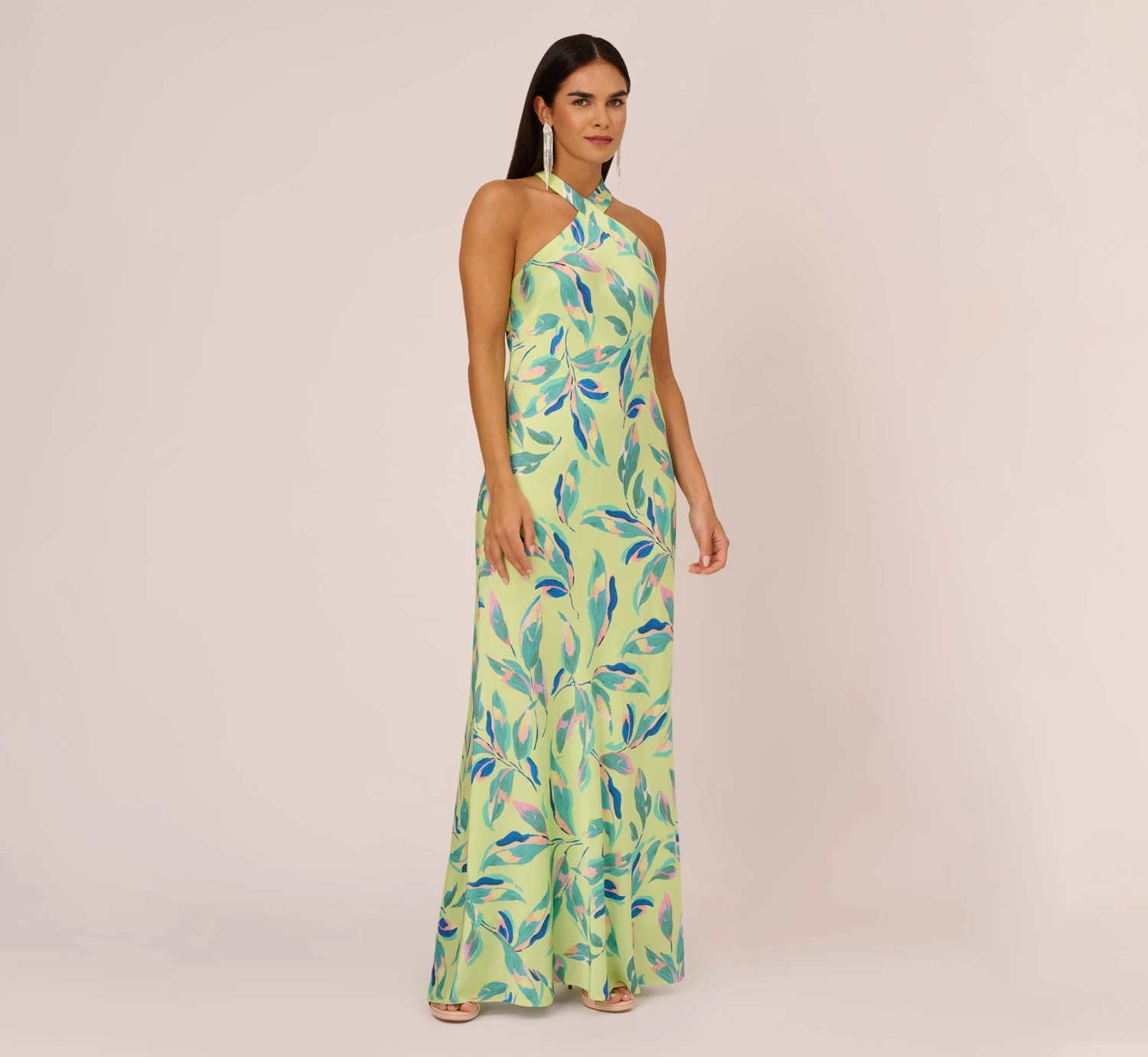 Show off this season with this show-stopping satin gown. This formal dress features a fitted bodice with halter neckline, mermaid skirt, and a keyhole back flanked by trailing cape details. Crafted from satin fabric covered in a multicolor foliage print, this dress has some stretch andwill add a bright touch anywhere it goes. Styled with neutral heels and a rattan statement jewelry, this dress will exude confidence.