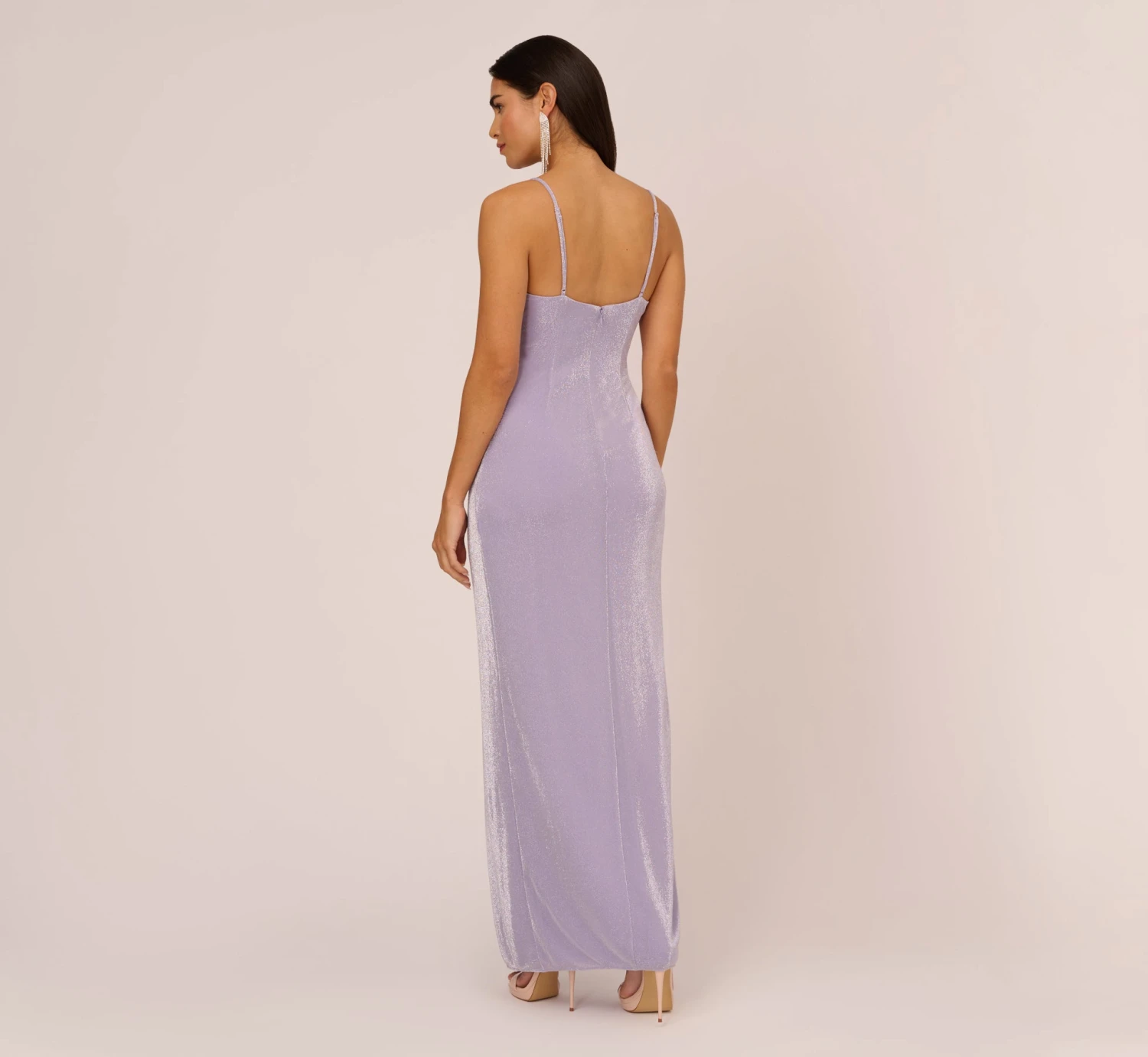 You’re going to love catching the light in this gorgeous formal dress. This evening gown features a surplice bodice with v-neckline and spaghetti straps, a slim skirt with center slit, and draped details that gather at the waist and accentuate the figure. Crafted from knit lurex fabric, this column dress has a sweet metallic sheen. A zipper back closes this design. Paired with neutral details or contrasting accessories, this metallic gown is a subtle way to make a statement.