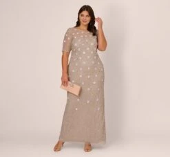 Adrianna Papell Plus Size Long Hand Beaded 3D Floral Dress With Elbow Sleeves In Marble