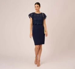 Adrianna Papell Sequined Guipure Lace Popover Stretch Knit Crepe Short Sheath Dress In Navy