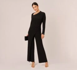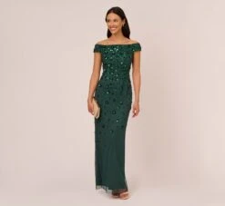 Bows and sequins add glamor to this off the shoulder gown. This formal dress features a fitted bodice, off the shoulder neckline adorned with sequin bows at the sleeves, and a column skirt with thigh-high slit Crafted from stretch crepe fabric, this dress has boning construction through the bodice and elastic at the sleeves for a structured look that stays in place all night long. A back zipper closure completes this evening gown.