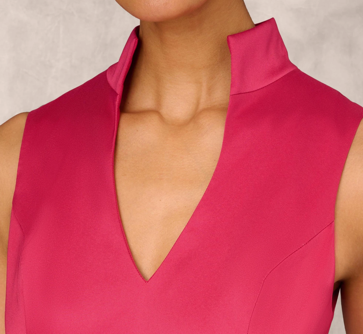 Expertly tailored and simply elegant, this classic ball gown is crafted of a substantial stretch Mikado with a lustrous finish and beautiful drape. This spectacular style has a dramatic stand collar and deep V-neck. Designed with bodice princess seaming and inverted box pleats on the skirt for added drama and a ball gown sweep. Finished with self-tie sash. Back zipper with hook and eye closure. Poly stretch lining.